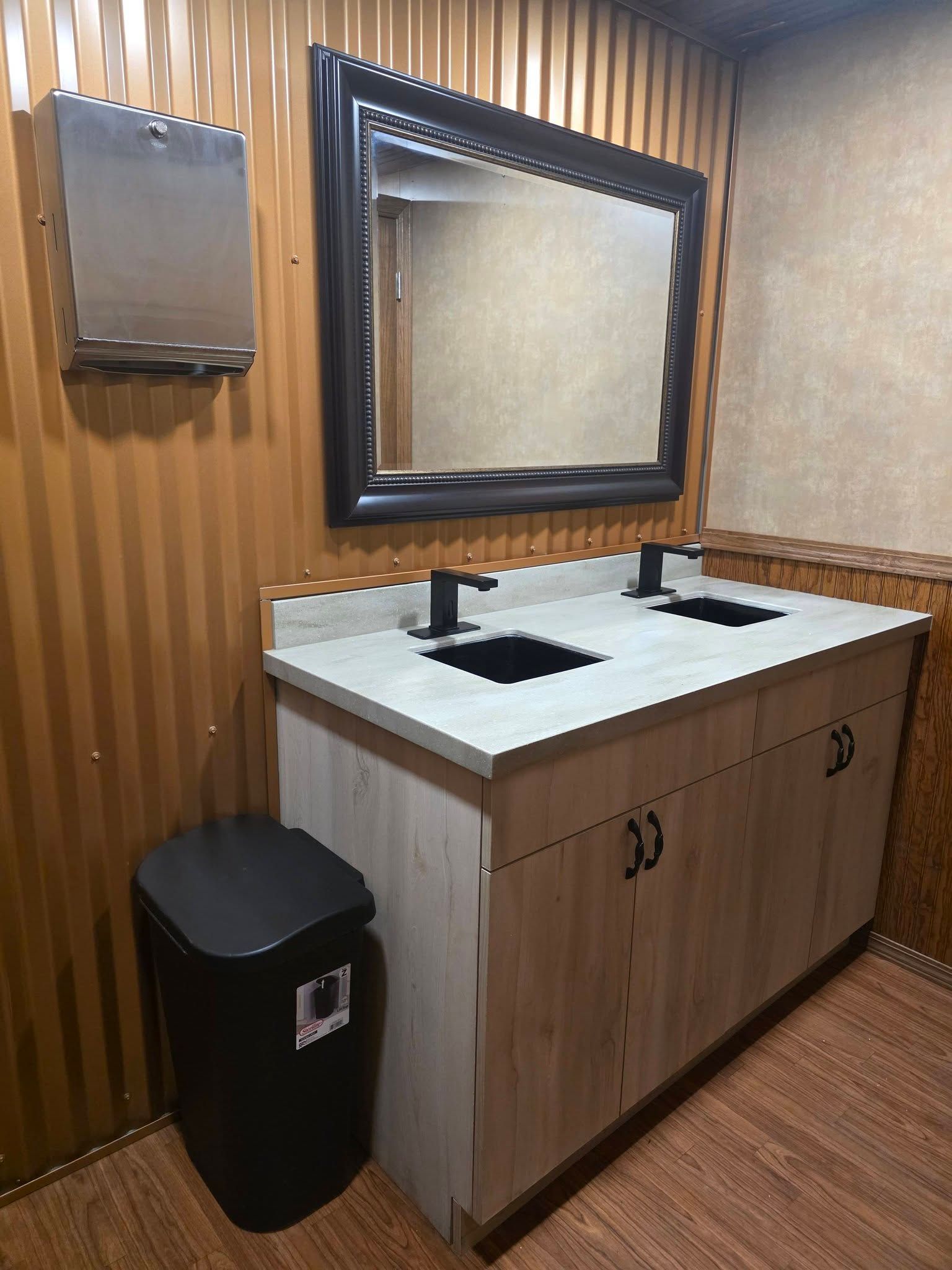 The trailer arrives on site with all utilities ready for connection, including water supply, waste holding, and electrical hookup for climate control and lighting. You coordinate placement with your event planner or site coordinator to ensure the trailer is positioned on level ground with access for guests and service if needed. The internal layout separates men's and women's areas, each with dedicated stalls and sinks, so guests do not share facilities or wait in mixed lines.